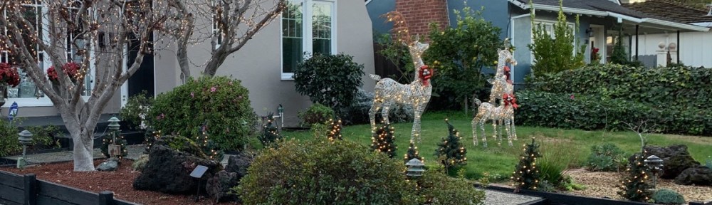 Elsewhere I saw entire blocks where there were almost no decorations. At least the age of the “inflatables” is mostly gone: there was a time just a couple of years ago when giant inflatable decorations seemed to be all the rage, and could be seen in the yards or on the rooftops of quite a few Redwood City homes. Remember the giant inflatable “snow globes”? With their blowing “snow” and other animations? I didn’t see any of those this year (there probably were a few somewhere, but I didn’t see them). I did run across a small number of homes with more tasteful inflatables, such as these:
