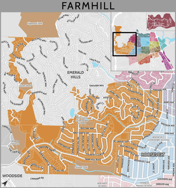 In area the Farm Hill neighborhood is probably the second largest among the seventeen. I haven’t tried to measure them, but from the larger map showing all of Redwood City’s seventeen neighborhoods, it appears that Redwood Shores is the largest, followed by Farm Hill.