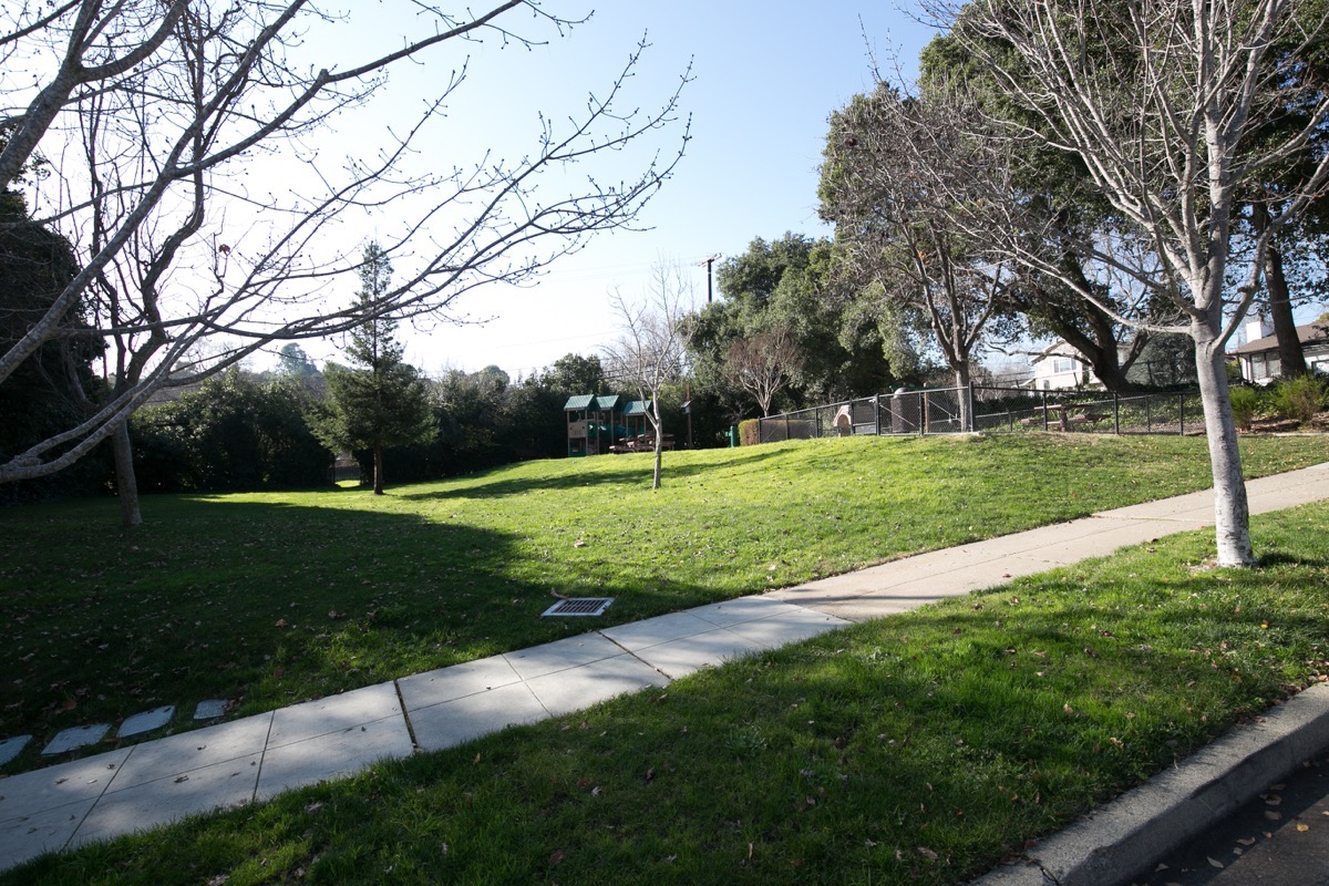 It wasn’t until I started researching the Farm Hill neighborhood that I became aware of the existence of the cute little Westwood Park. I wasn’t sure how I could have missed this one, until I actually paid it a visit. I’ve walked through the area a handful of times, and have walked within a block of the park, but unless you were specifically aiming for it, it is very easy to miss. This little quarter-acre park is located at the corner of Westwood Street and Briarfield Avenue, neither of which is a major street. For orientation, though, it is only two short blocks from the intersection of Alameda de las Pulgas and Roosevelt Avenue. The park consists entirely of a playground (with an enclosed “tot lot”) and a partially sloped grass area, along with a picnic bench or two. It has no restrooms, no BBQs, and no sports fields.