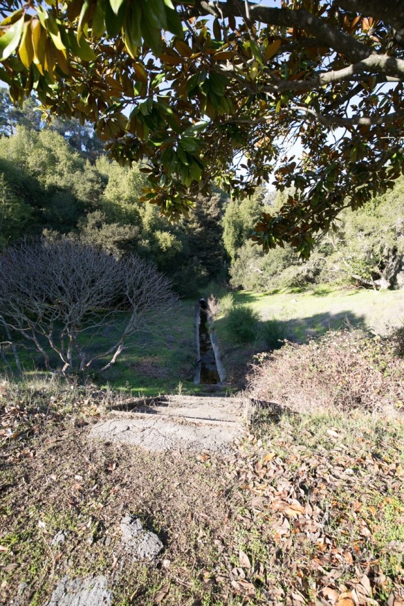 You’ll find this on the north side of Farm Hill Boulevard, in middle of the large undeveloped section across (and a bit further up) from Lonesome Pine Road. At the top of that canyon, incidentally, is the large property most people know as the Mount Alverno Convent — but since 2003 or so has been a Shinnyo-en USA Buddhist Temple. That it is where that tall tower you can easily see from a large part of the surrounding area is located: