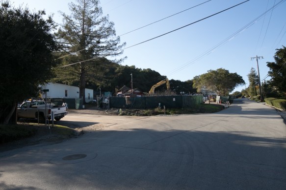 The above picture was taken roughly from the intersection of Jefferson Avenue and California Way. The road where the white pickup truck is parked is Tum Suden Way — which, incidentally, is a gravel road; something of a rarity within Redwood City’s borders. The green-covered hill above the construction site is where the Easter Bowl is located, and the cross is at the top of that hill, beyond the range of this picture. The Easter Bowl property is currently owned by the City of Redwood City, and is ostensibly managed by the Parks and Rec Department. However, other than a few signs and a path it is completely wild. That path is steep: it runs from the bottom to the top, just below where the Easter Cross stands. Although I didn’t walk up it this week, I’ve been on it before and I assume it is still traversable.