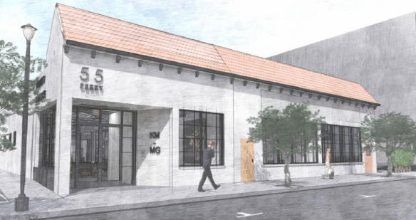 55 Perry was originally built back in 1929, as Sequoia Laundry & Dry Cleaners, and has been identified by the city as a “Historic Resource to be Preserved.” Thus, the plan is to largely preserve the historic facade (but gut the interiors, which are not historic) and turn the two buildings into office space. The building would remain as a single-story building, although it would gain a rooftop deck. Ultimately, the reworked building should look something like this: