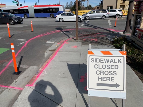 The new corner will “bulb out” to the pink lines drawn on the street. This will have a number of benefits, primarily (for me, on foot) lessening the amount of time I’m actually in the street when crossing at this intersection. In the interim, though, I of course cannot cross here.