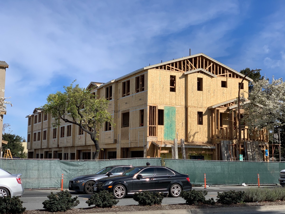 This week’s walk took me first to the 33-unit condominium complex going up where once Honda Redwood City did business. The complex will ultimately consist of five separate buildings, but those buildings are being built in an overlapping sequence. From the street the first building, which fronts onto El Camino Real, looks nearly done.