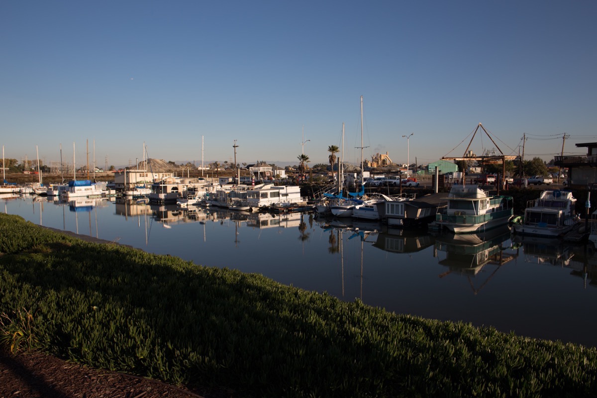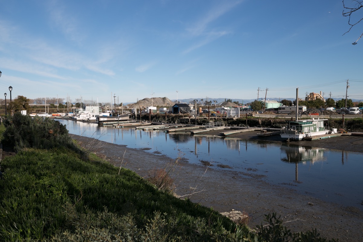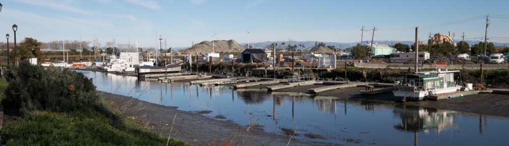 Docktown, as you probably know, is the floating home community that for years existed along this part of Redwood Creek. Although there may be a small number (likely, in the single digits) of people still living there, Redwood City, who is charged with managing the creek and who is operating under the legal understanding that private homes are not a proper public use of the creek, has been working to relocate the former residents. Much of this involved buying the floating homes and demolishing them (the city has had only limited success in selling them). For a long time many of the homes continued to sit, boarded up and unoccupied, making Docktown still look somewhat like it always did. But the city is finally making real headway on removing or demolishing the floating homes and boats: today very few remain. Back when it was a thriving community, Docktown looked like this (this picture was taken in December 2017):