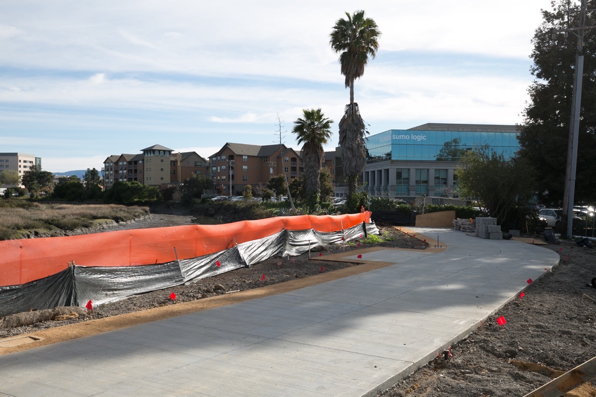 You can’t walk on this yet, and in any case it doesn’t really go anywhere, but this part of the trail is turning out very nice. Unfortunately, between this segment and the one behind the Township apartments (the building to the left of the two palm trees in the above picture) is the office building with the glass upper floors (home to “Sumo Logic,” apparently). In order for the path to connect it seems that part of that building’s parking lot would have to be removed, which I’m guessing isn’t happening any time soon. So for some time we’ll be left with a handful of short, unconnected segments that only a couple of die-hards such as myself will use.