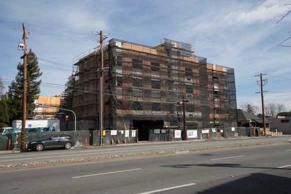Another project that seemed to drag on for quite some time is the four-story affordable housing project being built by Palo Alto Housing at 2821 El Camino Real in North Fair Oaks. This is the project that is going up next to the now-empty Eco Green Auto Clean car wash on El Camino Real. I wasn’t surprised that it took a long time to get off the ground, given that it is an affordable housing project. They often have special challenges, primarily around financing. But grading began around March or April of 2019, and the cement walls of the above-ground garage (which forms the ground floor of the building) were complete by late September. Four and a half months later, we have this:
