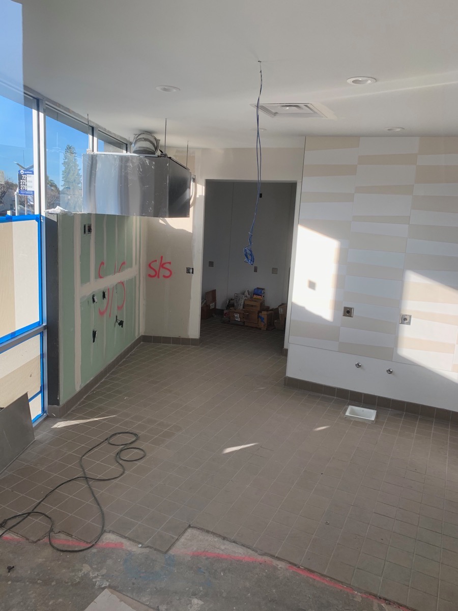 Across Woodside Road from the missing Shell station I peeked into the Dunkin’ (doughnuts) space. I have no idea what is taking them so long to convert what was a dry cleaners into a Dunkin’ store. I managed to get a look inside, and the space seems ready for fixtures and cabinets: