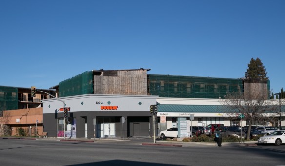 The above is an older picture showing what was on the site. Go by there today, however, and it looks very different. That small two-story office building (which sits right next to Redwood City’s Smart & Final store) is now completely gone. This is an essential early step in the Broadway Plaza project, since the CVS drug store on the main site will remain open for business until they can move across to their new location. And that means that although the three residential buildings that will make up part of the Broadway Plaza project can begin construction just as soon as any needed soil remediation has been completed, the three office buildings will have to wait until CVS has moved. Thus, the removal of this office building is the first in a sequence of steps that will result in the three new office buildings being built behind the Denny’s and Jack in the Box restaurants located at the corner of Broadway and Woodside Road.