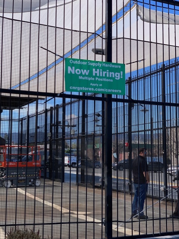 While I was there I observed a couple of guys working in the fenced-in area that OSH used for plants and outdoor materials. The doors to the store were open, and I observed someone sitting at a table doing paperwork — it looked as if he might be preparing to conduct interviews. I also saw some evidence that work was underway to reinstall checkout stands. Outside there were a couple of guys drilling holes into the side of the building, presumably so that they can install lights, signs, or cameras.