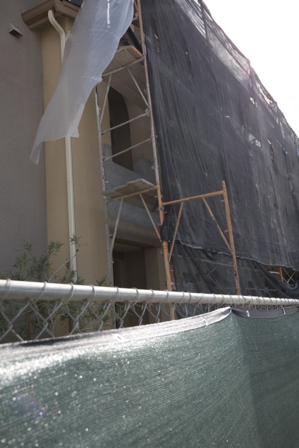 You can see the unpainted stucco beneath that second-story opening, which appears to be a shallow balcony in front of a window. I have no idea what the real problem was — perhaps the building was experiencing leaks, or perhaps they neglected to have the proper inspections done, or something — but this appears to be a rather costly fix. Fortunately the repairs appear to be nearly done, and soon the scaffolding, screening, and privacy fencing should once again be gone. I presume that whatever the issue was, they learned from it and are applying what they learned to the remaining buildings in the complex, which are at an earlier stage of completion. (The complex consists of five buildings, and the construction of those buildings is being staggered. This was the first of the five buildings to be constructed.)