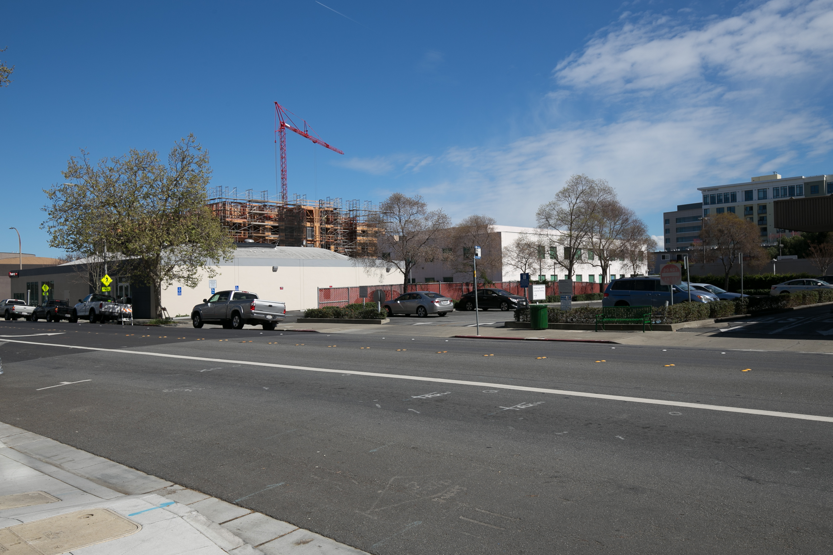 This shows the back side of the district office (the bright white two-story building just to the right of center) and the front and side of the single-story commercial building (to the left of center). Note the MidPen Housing project, under construction, looming up in the background.