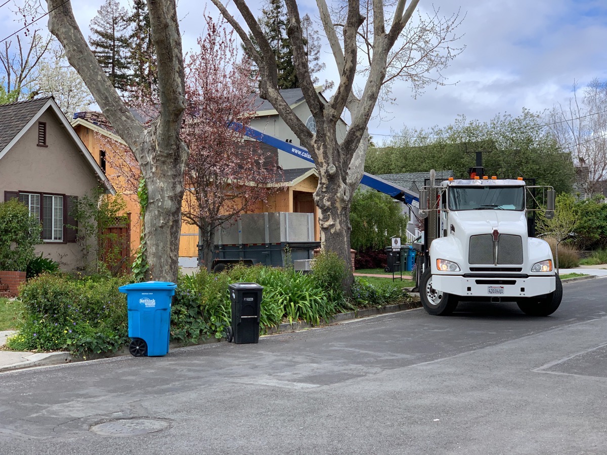These days we are supposed to refrain from “non-essential” activity. It did a lot for my psyche to be able to do our regular Meals on Wheels delivery route with my wife this week, since Meals on Wheels is understandably considered an essential service. And it is a real relief to see that street sweepers are still roaming our streets, trash is being picked up, mail and packages are still being delivered, and so forth. Such activity serves to make these difficult times feel more normal. Along these lines, although they not be strictly essential according to the shelter-in-place order, I continue to see a fair number of gardeners still going about their business, and a number of contractors still working on houses and buildings. For instance, on Wednesday I watched shingles being delivered to the unprotected roof of a house in the middle of an extensive remodel in the Eagle Hill neighborhood: