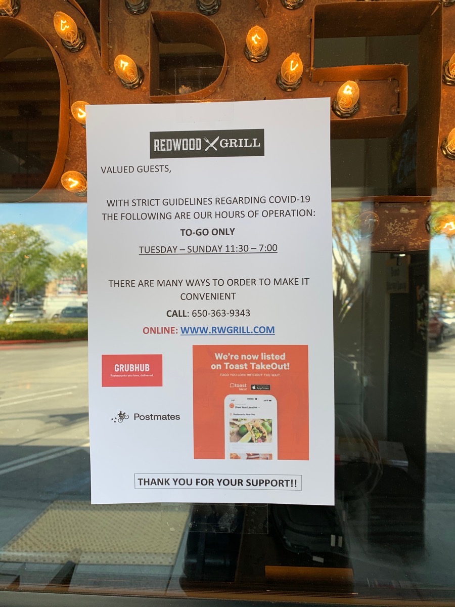 More often than not, though, restaurant doors or windows had signs indicating how you can order and receive your food. For instance, this one is posted at Redwood Grill, in Woodside Plaza: