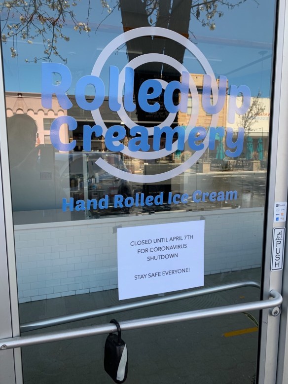 I spent a lot of time this week running around downtown and up and down Woodside Road (I have yet to fully canvass El Camino Real), trying to figure out who is still open and serving. As I said earlier, I was surprised at just how few restaurants have actually shut down altogether. Some of those were less of a surprise than others: the US Chinese restaurant on El Camino Real across from Target is closed for the duration, for instance, as is Bluefin Sushi (on Broadway, in downtown Redwood City), and the relatively new Rolled Up Creamery: