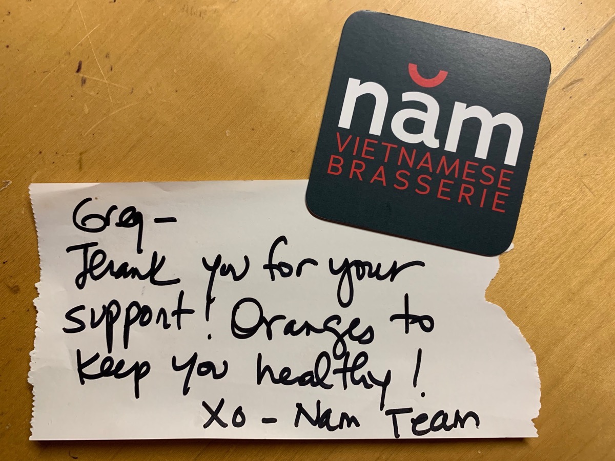 Downtown Redwood City is a lot quieter these days, of course, but it isn’t a ghost town by any means. A surprising number — the vast majority, in fact — of restaurants are still in operation, although of course they aren’t letting you dine in. Instead, they are doing what they can to provide high quality, tasty meals for takeout or delivery. The meals run the gamut, from fast food to deli sandwiches to ice cream (Baskin Robbins is still open, although they’re limiting the number of patrons who can be in the store at one time) to high-end dinners to coffee and a pastry. The other night my wife and I ordered from the recently opened Nam Vietnamese Brasserie, and we are very glad we did: the food was top-notch, and the service (we chose to pick it up, rather than have it delivered) was excellent. They even added a free orange to our order, with a note: