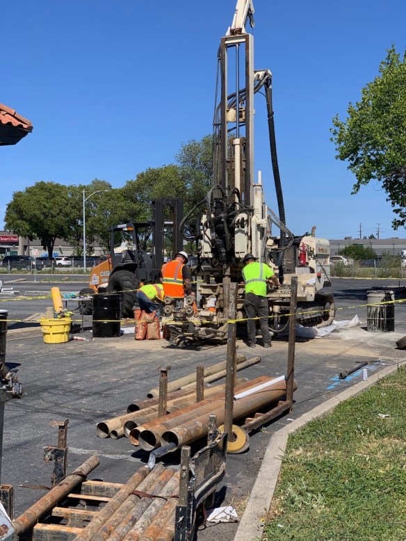 I wasn’t really expecting to see anything, but just in case I next checked up on Broadway Plaza. As you undoubtedly know, the shopping center at the corner of Woodside Road and Broadway is to be replaced by a large mixed-use project consisting of three office buildings and three apartment buildings, one of which will include a small amount of retail space. Some time ago most of the shopping center was torn down and a portion of the parking lot was removed so that soil testing on the site could be done. That soil testing was expected to take about a year, so I didn’t really expect to see much activity. And truly, I didn’t see a lot. But I was pleased and a bit surprised to see soil testing going on in a different part of the site, near the back corner of the one remaining business, the CVS drug store: