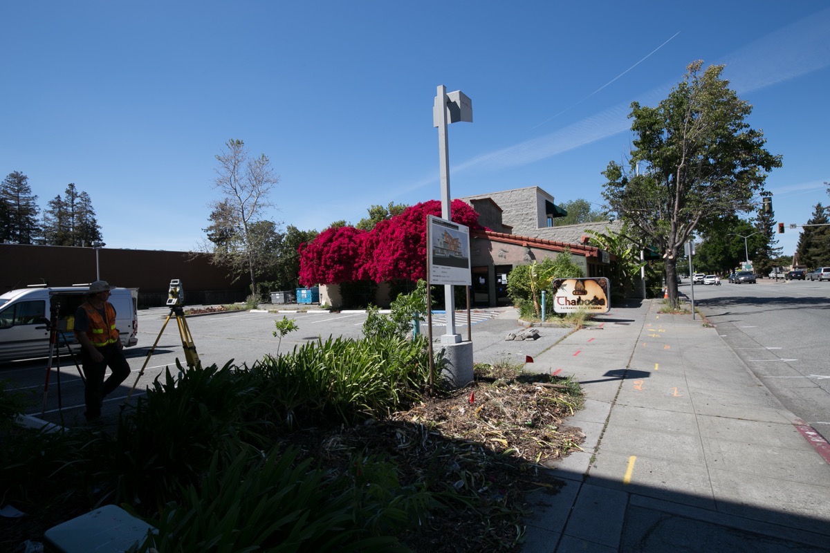 Moving on, I headed over to Woodside Road, wanting to make sure that the rebuild of the fire-damaged Hallmark House apartment building was truly underway. I’m delighted to report that it is: I could see evidence of activity and could hear the sounds of the construction (well, at this point, demolition) workers emanating from the building’s ground-floor garage (inside of which the workers seem to be parking, incidentally). But along the way I passed by 910 Woodside Road, the former home of Thaibodia Restaurant. That restaurant (which closed their Redwood City store at the end of last month) will be torn down and replaced with a 10-unit condominium building. I’ve been waiting for this project to get underway for literally years now, and finally it seems that it is. As you can see in the following picture, there was a guy apparently doing some sort of surveying on the property when I was there: