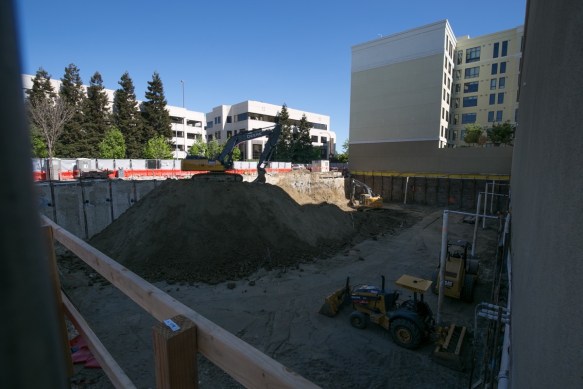 Because they met the criteria for allowable construction, the Arroyo Green senior living project and the 20-condominium Habitat for Humanity project never did stop, and they were indeed active when I went by earlier this week. The nearby six-story office building being constructed in the crook of the Marston apartment building at 610 Walnut St., on the other hand, has sat idle since April 1. When I went by on Tuesday I didn’t see any activity, but I will admit that I was there late in the day and they might have already knocked off work. I went by again on Wednesday, though, and there was plenty of activity on the site. At the moment they’ve dug the rather deep hole needed for the building’s underground garage; it shouldn’t be long before they pour the garage’s cement floor and then start working their way upwards: