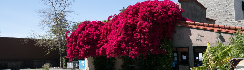 He’s to the left in the above picture, in case your eye was immediately drawn, as mine was, to the magnificent Bougainvillea plant covering a significant part of the restaurant building. If you happen to be in the area, you might want to give the plant a gander: regretfully, when the building comes down, so too will this magnificent crimson plant. In the event you want to go by and see it, I should also mention that a sign posted on the building announced that between May 10 and June 10 crews will be installing underground utilities across Woodside Road. The sidewalk on this side of Woodside Road will be inaccessible during that period, and I imagine that there may be some disruption to the traffic along Woodside Road as well.