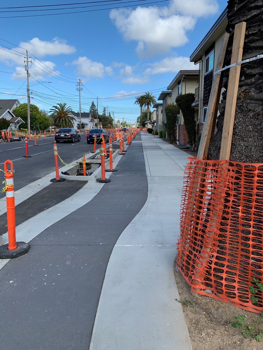 It is nice and wide, and in many spots will be separated from the street by planting strips. They’ve used two colors of concrete, making for a sidewalk that is comfortably wide without looking like it. I’ve been watching this project for some time but this week is the first time I’ve been able to actually walk on the sidewalk itself. I can’t wait until the planting strips are filled and all of the overhead wires are removed (one of the main efforts of this project is to underground all of those wires). Middlefield Road is a great way to get to the vicinity of Costco, OSH, and Sigona’s Farmer’s Market, and this sidewalk will go a long way towards encouraging many people to leave their cars at home when taking a shopping trip.