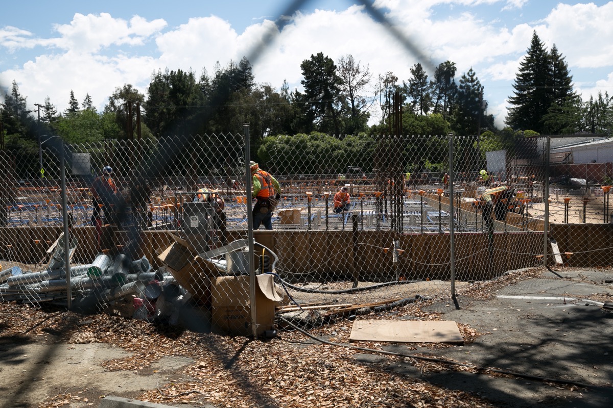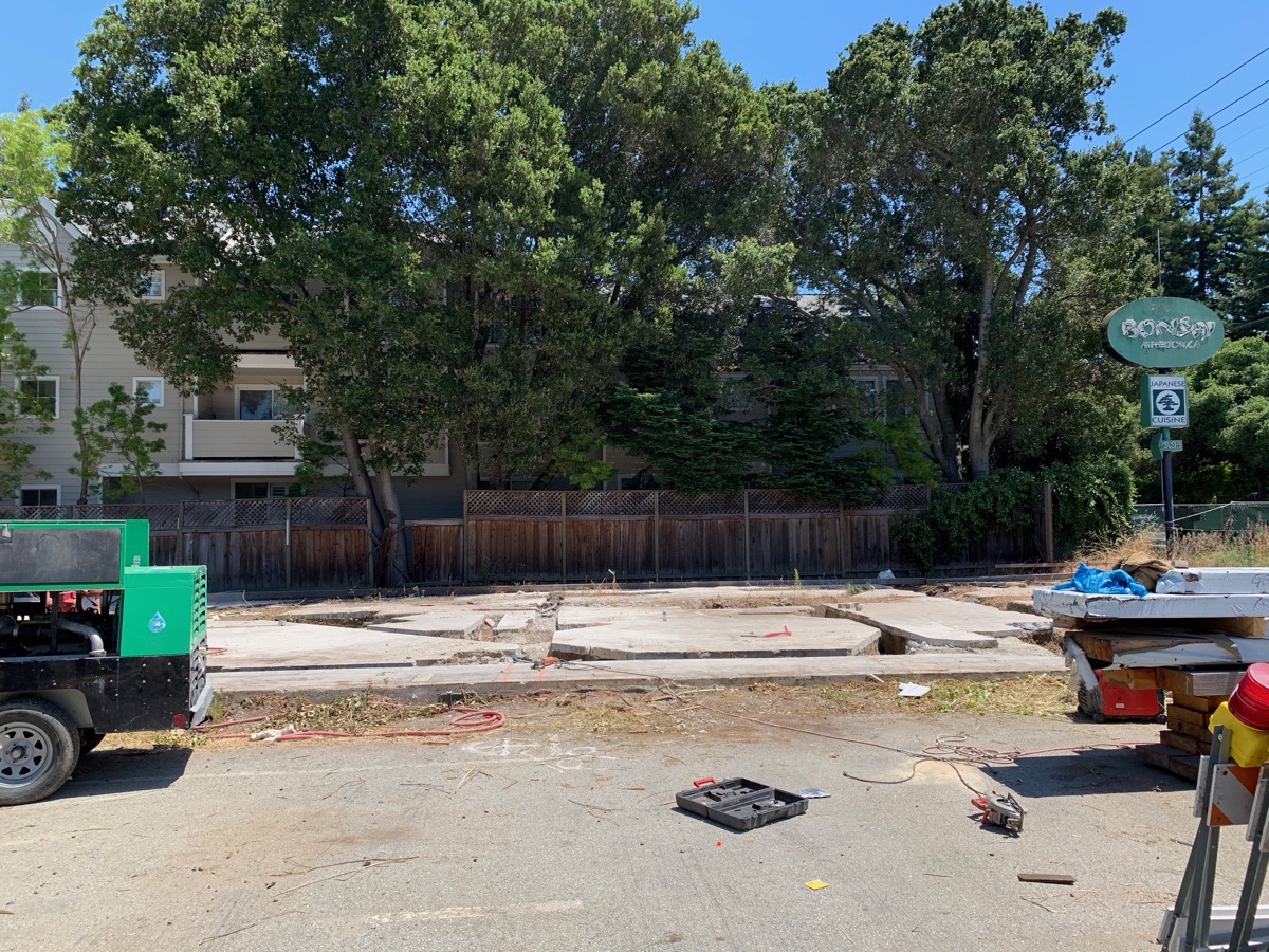 As it turns out, the developer had gone too far, tearing out more of the original building than was permitted. Accordingly, the developer had to draw up new plans and go back to the county for updated permits. After going back and forth with the county, the developer was finally given the green light to proceed with the project. Together, all of this explains the long period of inactivity that so many of us who drive up and down El Camino Real witnessed and wondered about. Once the county gave the OK, though, the developer wasted little time in tearing down the rest of the structure, leaving only the building’s original slab, along with the slab that had been poured for the new addition.