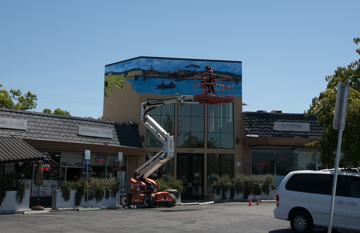Artist Claudio Talavera-Ballon is having to paint this thing entirely from the elevated platform of a cherry picker, which can’t be easy. But he seems to be doing a really great job. According to the artist, this mural will depict “the thriving chrysanthemum industry established by the Japanese community that would gain Redwood City the title of the chrysanthemum capital of the world in the 1920s.” So far he has mostly painted a stylized, historic view of Redwood City and its waterfront; still to come are the fields of chrysanthemums. (If you are just dying to see what the finished mural is going to look like, there is a rendering on the artist’s website.) This mural is being painted on three sides of the tower block, and should be quite a stand-out feature of this popular residential shopping center. Incidentally, it appears that Project CATA was involved in bringing this to Redwood City. Thanks to CATA Director Cary Kelly and his folks for their continuing efforts to beautify some of Redwood City’s nooks and crannies, especially in these challenging times.