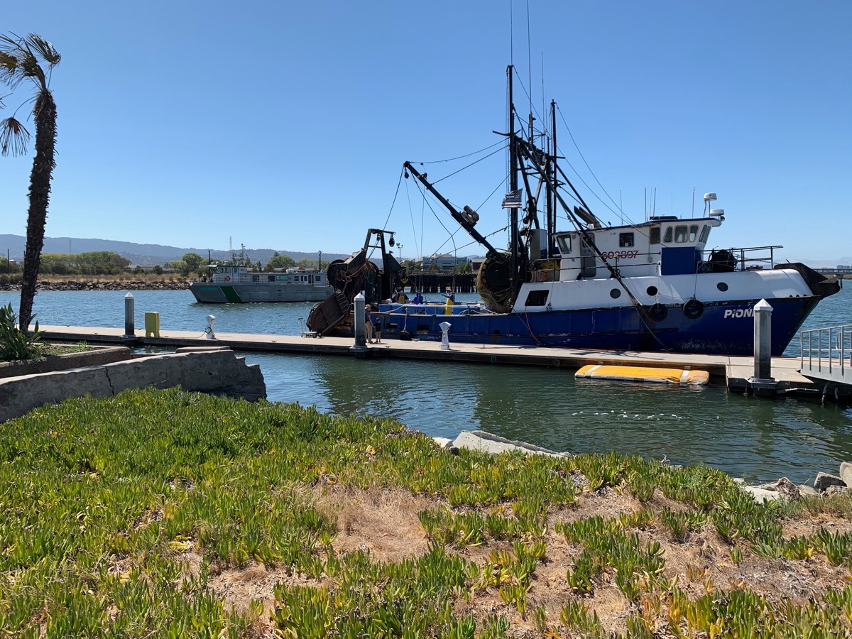 Many of you may already have heard the news that Giuseppe Pennisi, the owner of Pioneer Seafoods (which consists of a 76-foot fishing boat “Pioneer” and a recently purchased food truck/trailer), has shifted his operation from San Francisco to Redwood City. In case you have not, most days of the week Giuseppe and his helpers can be found docked at the end of Seaport Court, very close to where his bright yellow food service trailer is parked. I took a walk out there this week (on Tuesday, when it was cooler) to check out his operation.