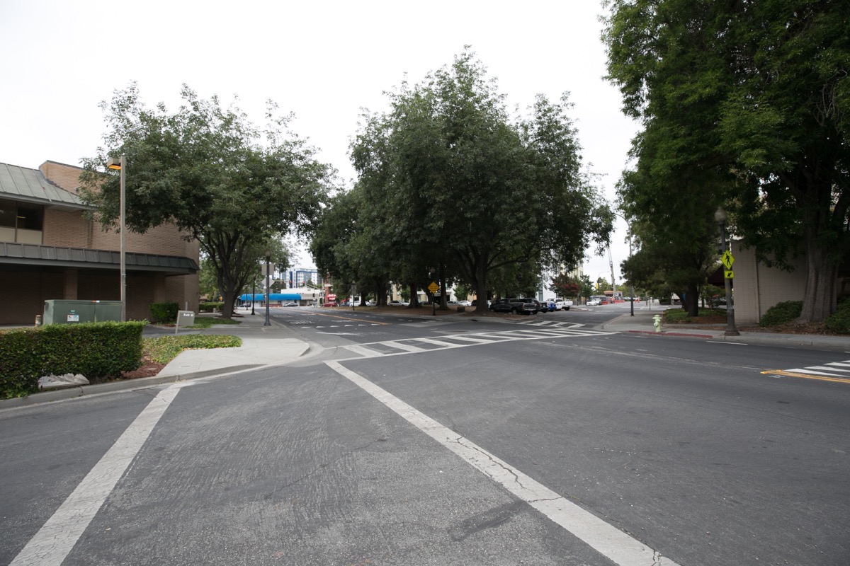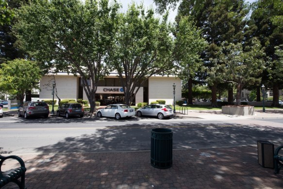 Unless they want to continue straight through downtown, cars driving from Woodside Road towards El Camino Real along Broadway generally angle right onto Spring Street and then angle left when they reach Marshall Street. The above picture shows Spring Street. In this picture the Wells Fargo Bank is the building on the left. The small park that they want to take over is in the center of the photograph, with the large trees. The portion of Spring Street that they want abandoned lies between the two; Spring would then dead-end at the striped crosswalk you see in the center of the image. By combining these three parcels Wells Fargo’s current five-sided parcel would expand into a full rectangle.