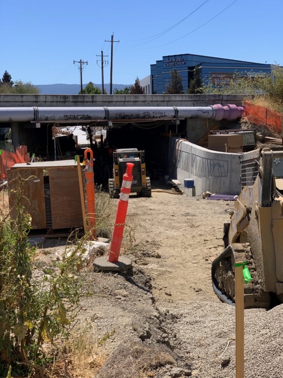 One reason I keep walking over to the bay side of Highway 101, in addition to monitor the progress on the Strada project, is to see how the Highway 101 Pedestrian Undercrossing is coming along. That project has gone very slowly: it has been underway for more than two years now. Of course, its proximity to a waterway — Redwood Creek — could have resulted in a lot of extra red tape that needed to be dealt with throughout the construction process, and may explain why there have been so many points during this project’s lifecycle in which it seemed to come to a complete halt for months at a time.
