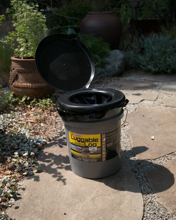 If you are thinking that that looks like a 5-gallon bucket with a toilet seat attached to it, well, you’re right! The basic unit runs about $25, but you can save even more if you provide your own bucket. The seat and lid (which snaps closed to help block odors) can be purchased separately, but as you can see I bought the set. I also bought some of their specially designed liner bags, although you really don’t need those; almost any plastic bags will do. The salesman made what turned out to be a terrific suggestion: pour some kitty litter into the bucket. It absorbs the liquids and takes care of the odor (no surprise, given that that is what it is designed to do). Oh, and, note that this thing is an ideal addition to your disaster kit (which, prompted by the fires, you should be thinking about if you haven’t already).