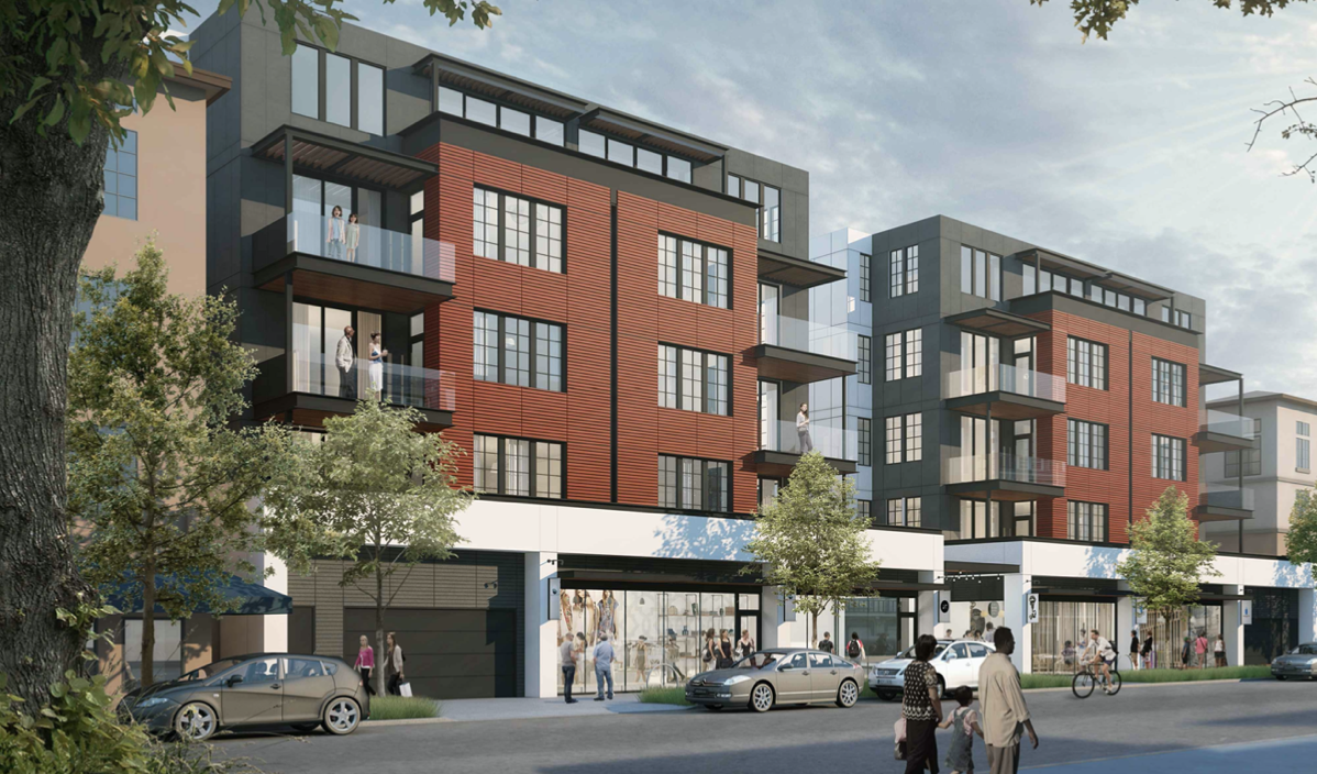 The plans call for two five-story buildings with parking (using stackers to squeeze in enough cars for the 35 residential units) and retail spaces on the ground floor of each. The upper floors of the two buildings would be connected by an open bridge, as shown in this second rendering: