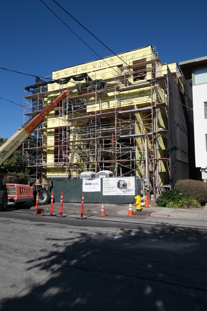 I did eventually cut down to Laurel Street, since, as far as development projects go, that is of course one of San Carlos’s hot spots. I first took a look at the six-unit condominium project going up at 1040 (and 1052) Laurel Street. This is a particularly fascinating project in that the units are being built using some very unconventional construction techniques and materials: