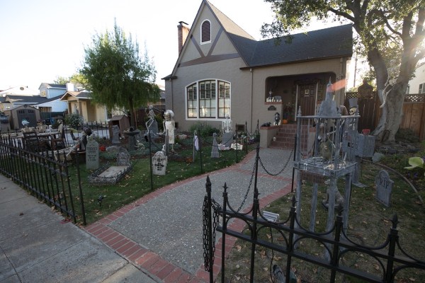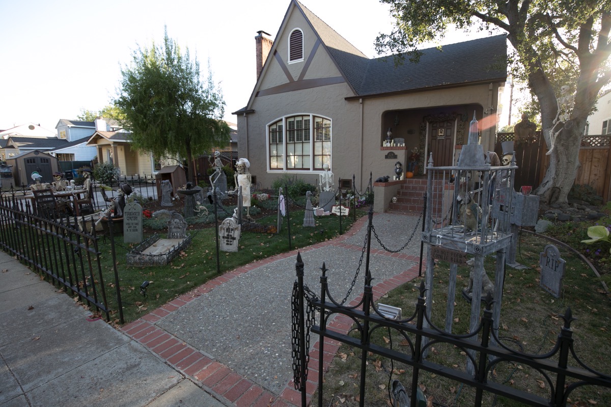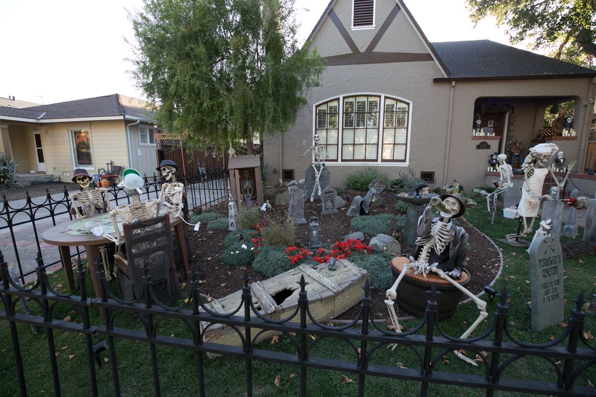 Although my household won’t be involved in any way with trick-or-treating this year, I of course continue to marvel at the many decorated houses around the city. I was particularly delighted to see that the Turnsworth Cemetery, my favorite house of the past two years, is indeed up and running again this year. They wisely opted not to put out the laser pointers — who knows what the health status is of the people who held those pointers before you that night — but I presume that the automation is otherwise still in full operation (I have yet to go by during the evening, and hope to do so tonight). This place is impressive in the daytime, but should be even better at night, if past years are any judge.