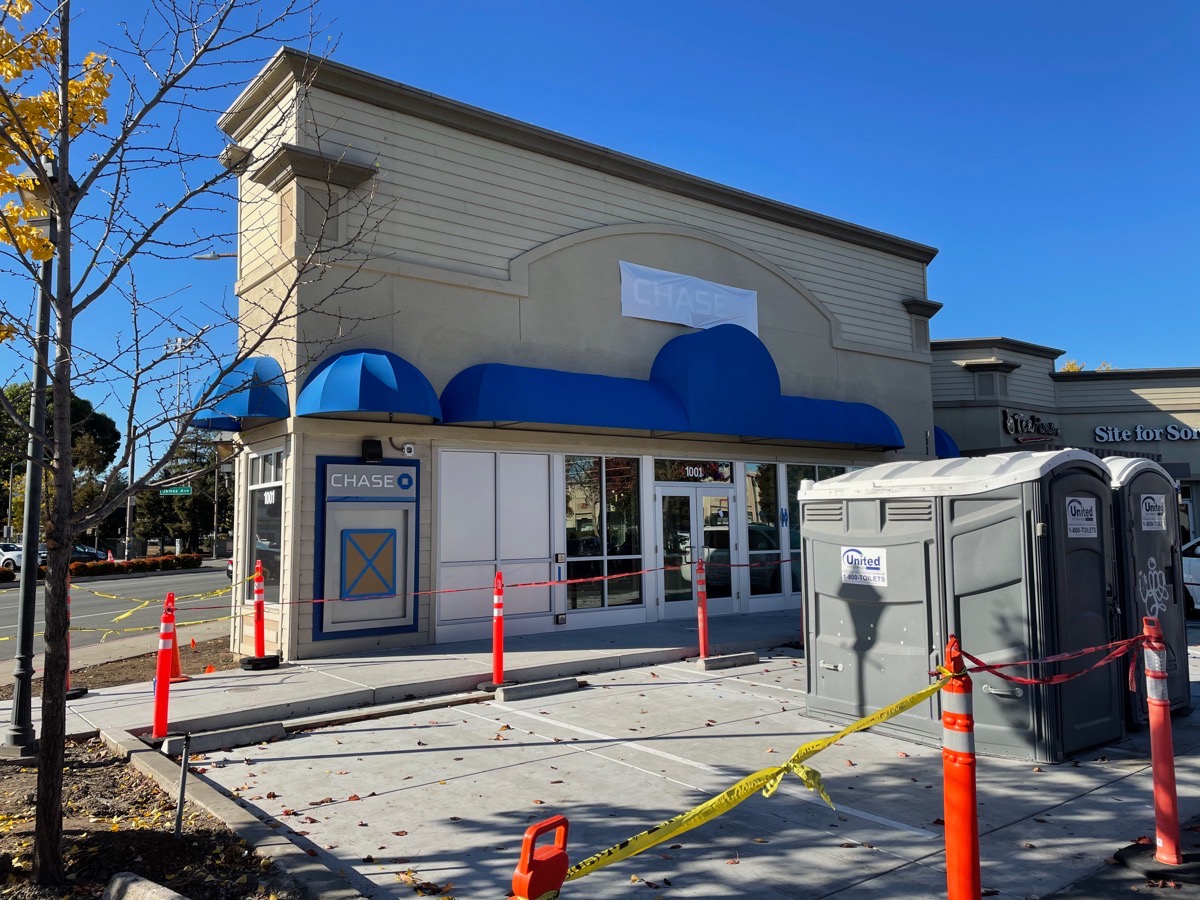 Just steps away, I checked on the progress being made on the new Chase Bank that is going into the Sequoia Station space where Max’s Café used to be. The construction crews really seem to be humming along now. Having virtually completed all of the necessary exterior work, they now seem to be concentrating their efforts on the interior, which still has a way to go. But the exterior signs are already installed (they are temporarily covered up for the moment), so once the interior is complete this place should open quickly.
