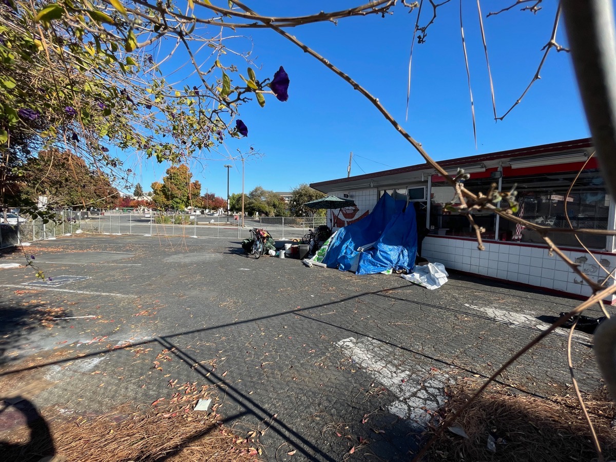 It seems that someone has decided that the disused Yumi Yogurt building, which has been surrounded by temporary chain-link fencing, is a great place to set up a small homeless encampment. Whoever it is sure has an impressive amount of stuff piled up there.