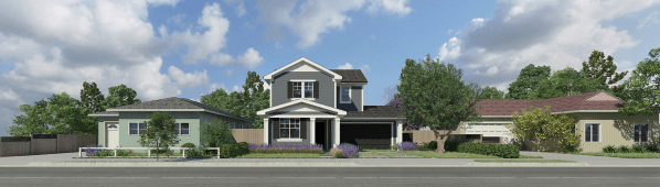 While the total number of houses that TJ Homes currently has underway in Redwood City is significant, I’m pleased to note that these homes, although not small, are by no means “monster homes.” All are two-story homes, and all, I believe, sport four bedrooms and three bathrooms. The smallest that I am currently aware of has 2,432 square feet of living space (not including the two-car garage or any decks or porches), whereas the largest has 2,997 square feet of living space. Of course, size is relative — in this case, relative to the homes in the immediate vicinity. So whereas a 2,997 square foot home might not be a “monster home” on paper, if it sits among a sea of, say, 1,500-square-foot one-story homes, it could indeed look like a bit of a monster. So each home needs to be considered in context. Fortunately, plans for some of the projects are easily accessible online, and those plans include renderings showing the homes as they would appear from the street. For instance, here is a rendering for the home to be constructed at 1741 Connecticut Drive (in the Roosevelt neighborhood):