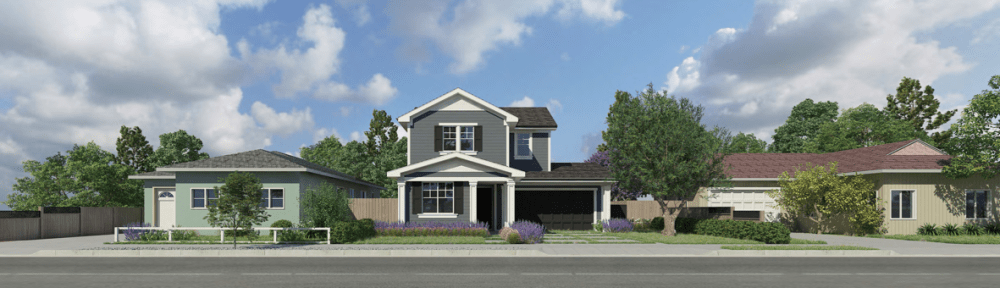 While the total number of houses that TJ Homes currently has underway in Redwood City is significant, I’m pleased to note that these homes, although not small, are by no means “monster homes.” All are two-story homes, and all, I believe, sport four bedrooms and three bathrooms. The smallest that I am currently aware of has 2,432 square feet of living space (not including the two-car garage or any decks or porches), whereas the largest has 2,997 square feet of living space. Of course, size is relative — in this case, relative to the homes in the immediate vicinity. So whereas a 2,997 square foot home might not be a “monster home” on paper, if it sits among a sea of, say, 1,500-square-foot one-story homes, it could indeed look like a bit of a monster. So each home needs to be considered in context. Fortunately, plans for some of the projects are easily accessible online, and those plans include renderings showing the homes as they would appear from the street. For instance, here is a rendering for the home to be constructed at 1741 Connecticut Drive (in the Roosevelt neighborhood):