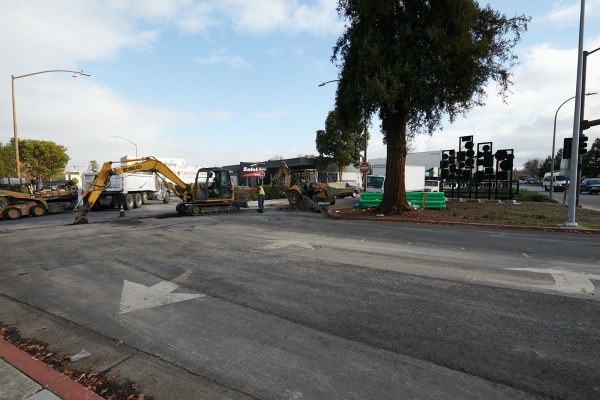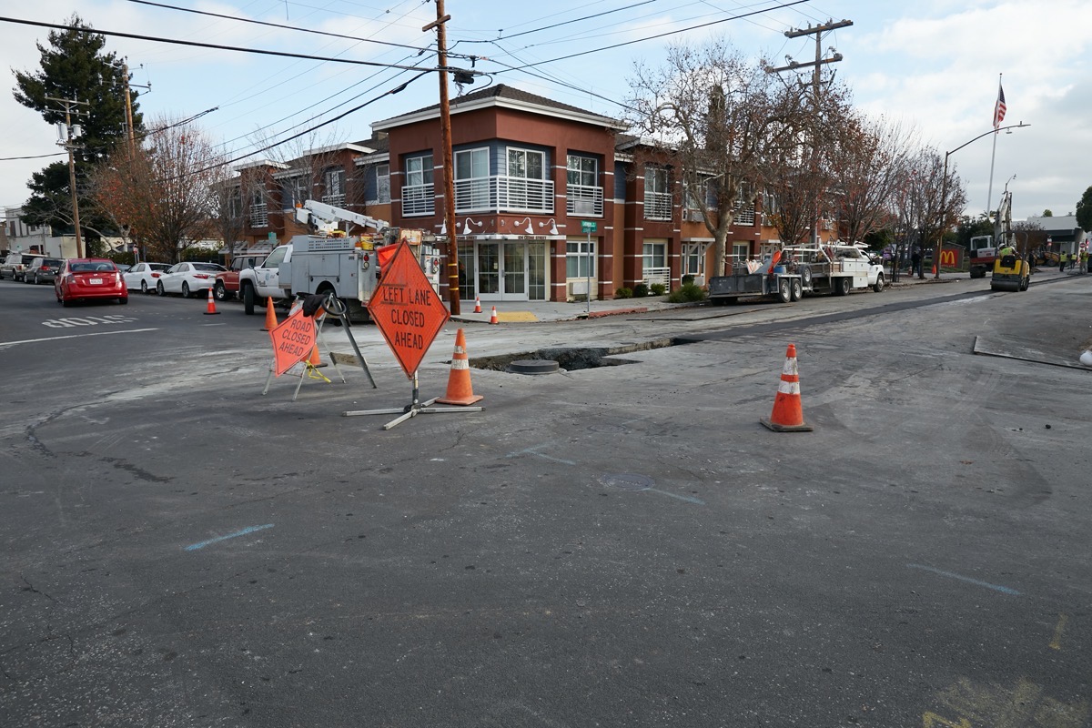 As you can probably see, crews are cutting a trench right down the middle of the street. They appear to be replacing (or adding) sewer pipes; there were a pile of them in the little triangular parklet where Lathrop Street angles off from El Camino Real: