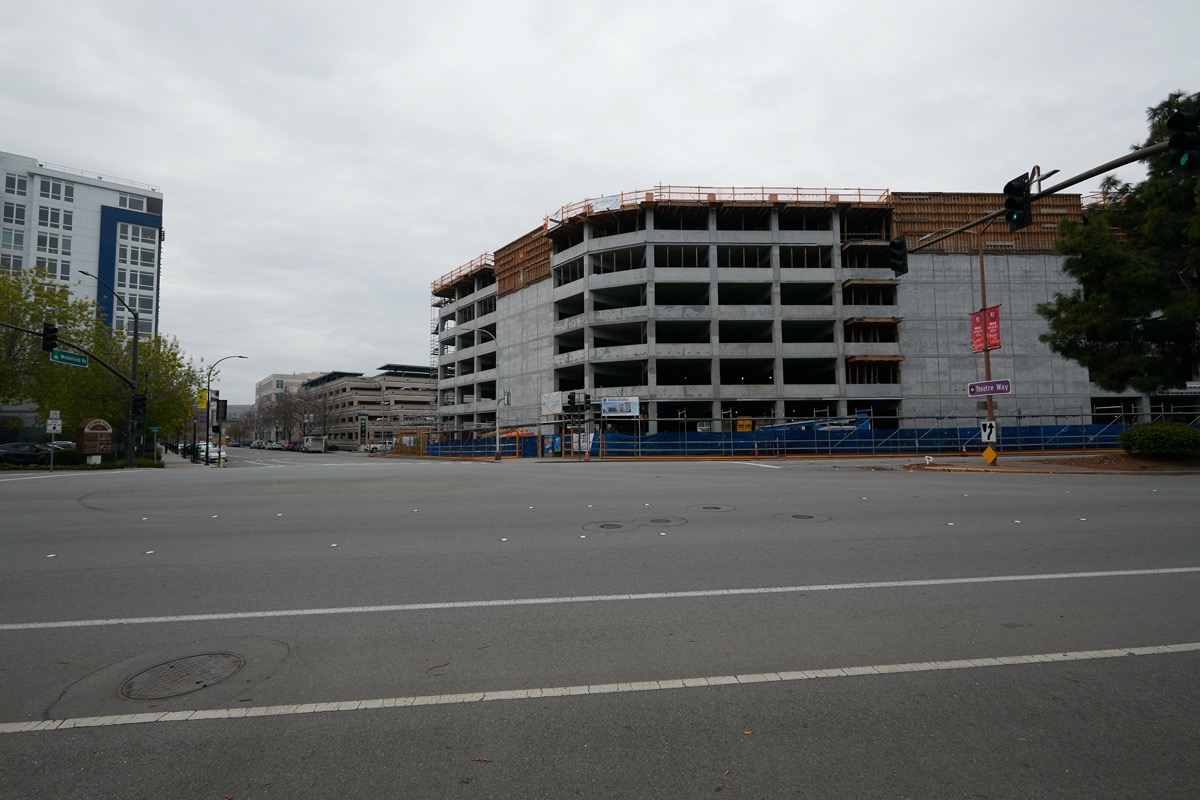 To take this photograph I stood on the sidewalk on Veterans Blvd., and aimed my camera down Middlefield Rd. On the left, you can just see a bit of the 10-story Indigo apartment building, and, in front of it, signage for a couple of restaurants and retail shops located just beyond the left edge of the frame. The primary subject of the photo, though, is the under-construction San Mateo County parking garage. As you can probably tell, this garage is going to be a whopper: this seven-story structure will have 1,022 parking stalls and will augment the existing 797-space county garage that you can just make out in the above photo; it is the next structure down Middlefield Rd. on the same side of the street. Together these two structures will provide close to 2,000 parking spaces for county employees, jurors, and people having business with the county.