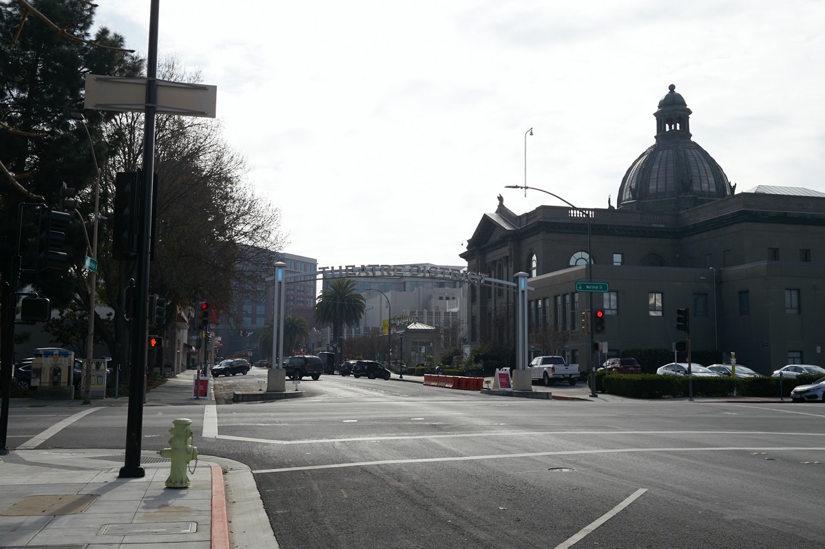Courthouse Square is just off the right edge of the above image; this is the large mostly open plaza in front of the historic county courthouse that Redwood City likes to think of as its “outdoor living room.” It serves as a theater of sorts on select summer nights, when the city erects a large outdoor screen and shows free movies for anyone who wants to come out and watch. Of course, Courthouse Square has a lot of other uses as well, including serving as a host location for art festivals, protests and rallies, and concerts.