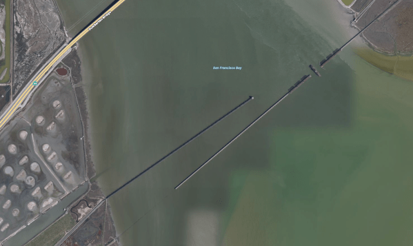 In this image, the tan line running from the left edge of the photo to the top is Highway 84 and the Dumbarton Bridge. The lower of the two darker lines — the one running from the upper right corner of the image down towards the bottom — is the Dumbarton Rail line. Note the rotating section of the bridge, which is in the “open” position. If you follow the line from right to left, it appears to just stop mid-bay, but if you look really carefully (again, you may want to zoom in) you can just make out a faint continuation of the line through the water showing the remains of the burned trestle that once stood there.