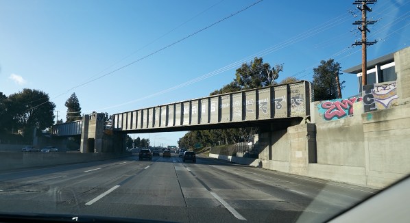 From Redwood Junction, the Dumbarton Line slices diagonally through North Fair Oaks. The line here is a bit tricky to follow since there are few streets that parallel it. Eventually, the tracks cross into Menlo Park, and then make their way over Highway 101. Here is the overpass that carries the Dumbarton Line tracks, as viewed from the freeway (my wife had to drive me so I could take this picture):