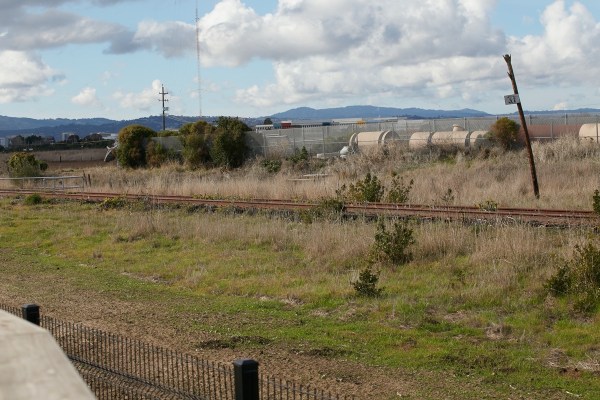 The above shows the rail line as viewed from the Bay Trail running through the preserve. In the distance, beyond the chain-link fence, you can just make out the multi-colored buildings of Facebook headquarters, on the north side of Highway 84.