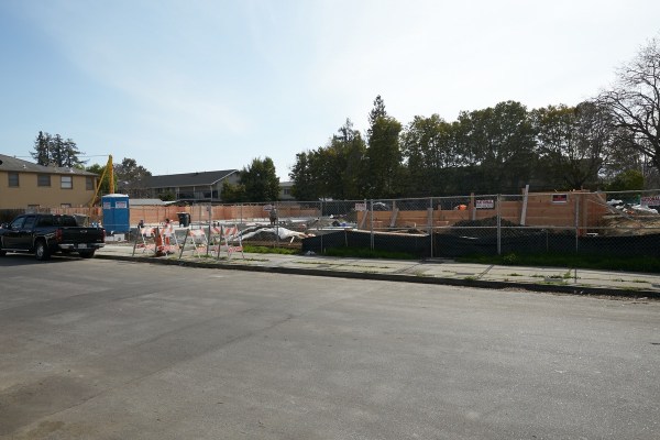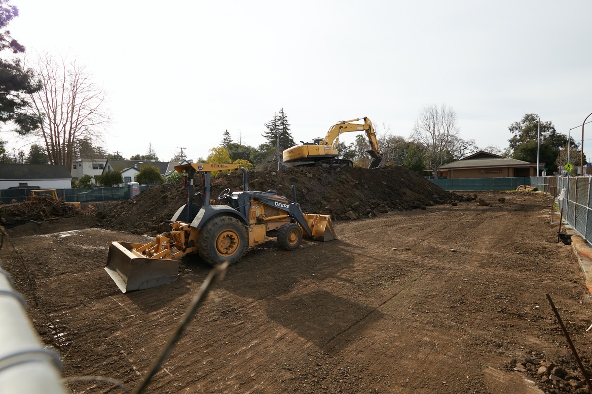 At the northern end of town, yet another townhouse project has finally gotten underway. The property at 120 El Camino Real until recently was where you would find the old Mountain Mike’s Pizza building (which has been empty and deteriorating for a couple of years now, ever since Mountain Mikes moved north into San Carlos). Some months ago that building was torn down, and now, finally, work has begun in earnest to construct One20 Townhomes, a 12-unit townhouse complex that will look somewhat like the one recently completed next door, at 150 El Camino Real. When I paid a visit to the site this week, half of the property had been dug up, presumably so that a solid foundation could be put in place beneath one of the complex’s two buildings:
