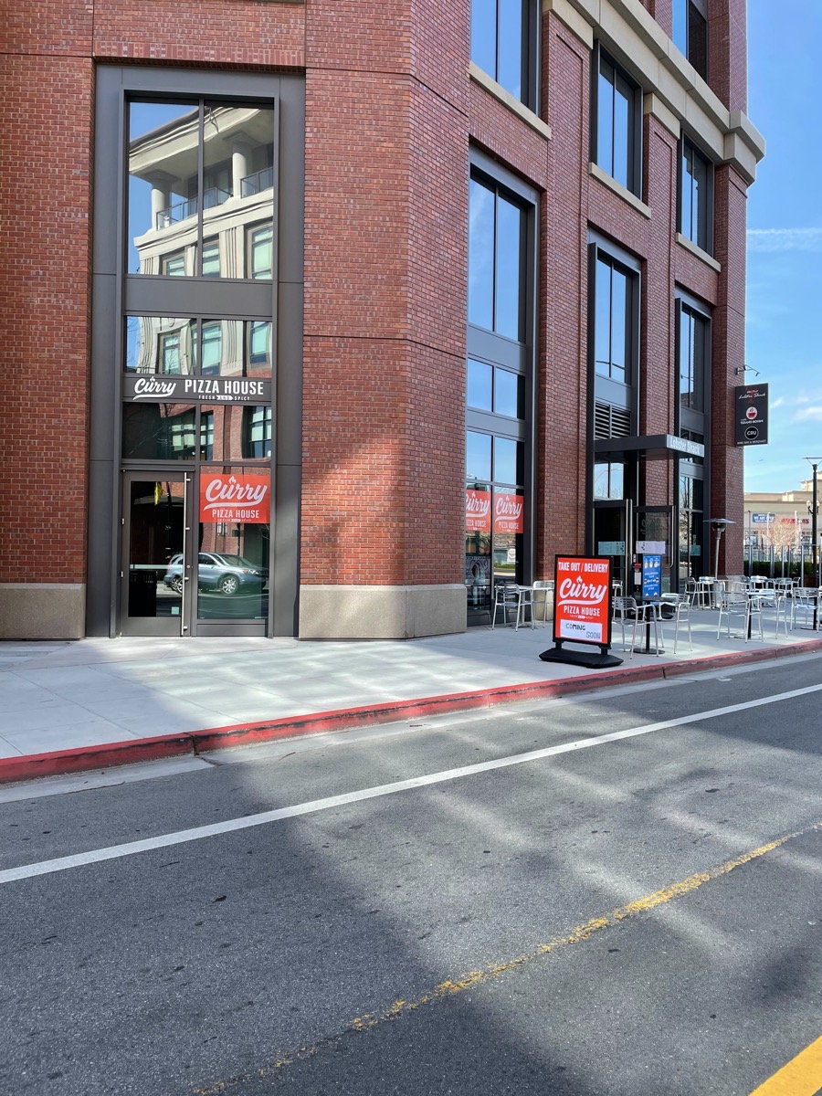 Next up is the never-occupied space next door to Old Port Lobster Shack in the Box buildings, at 900 Middlefield Rd. Recently, a sign went up on the doors to the space, along with a free-standing sign on the sidewalk out front. These signs indicate that this location will be the future home of Curry Pizza House (“Fresh and Spicy”):