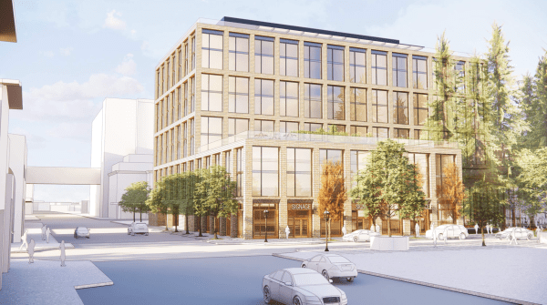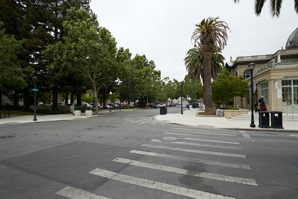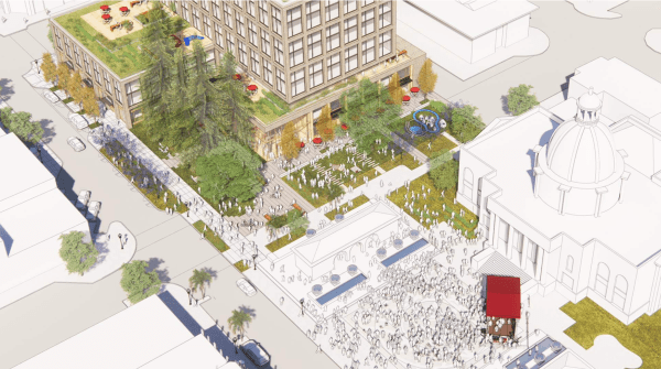 This rendering provides a clear view of how this part of Hamilton Street would be repurposed. It also shows how the new building would form an ‘L’ around the redwood grove. Not visible is the building’s main lobby, incidentally, which would be located behind the redwood trees, where the two wings of the building meet.
