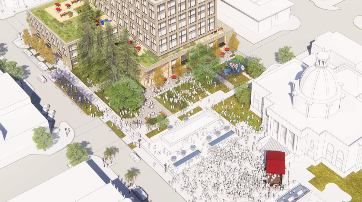 Note the redwood grove (the tall trees in front of the building). As for the buildings on Courthouse Square, those are essentially obscured by the tree along the right edge of the rendering.