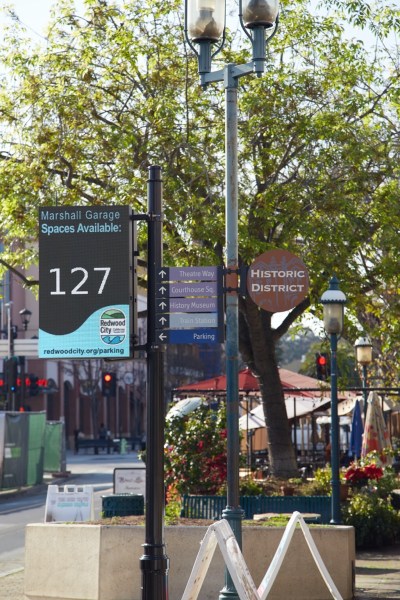Although I haven’t yet had time to learn exactly what these signs might be for, a likely guess is that they are candidates for the electronic signs that the city has for years been talking about installing, signs that would direct motorists to available parking. If that is the case, I question whether these particular ones are noticeable enough, and whether they have enough display capacity, to properly do the job. Compare them with the much larger signs in front of Redwood City’s two downtown parking garages. Those signs — which display nothing more than the available capacity at that one garage — are much more visible and much better at presenting the most important information in a glance-able fashion: