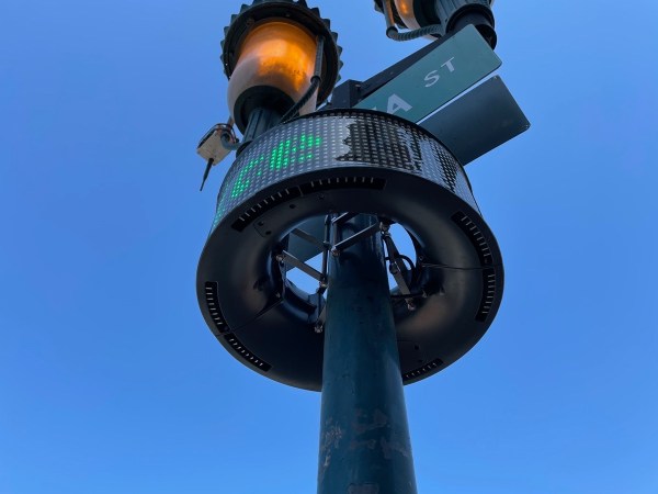 As you can probably tell, this is a completely circular LED sign that can be used to display text (and very limited graphics, I presume). Notice how the streetlights are on during the daytime? It appears that for the purposes of this test, they are simply drawing power from the lights above the test sign, and thus require that the streetlights be on so that the sign can work. If these new signs pass whatever test is going on (the text that was slowly scrolling around the sign simply said “Test Device”) and are installed for real, presumably the lamppost would be rewired to have always-on power in addition to the switched power that causes the lights to be on at night but off during the daytime.